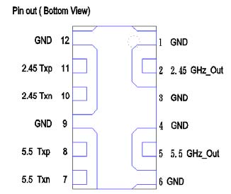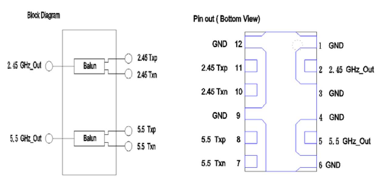 The BL118BC is a ceramic dual-band WLAN balun using LTCC design and manufacturing technology. The module consists of two baluns, one for the 2.4–2.5 GHz band and one for the 4.9–5.9 GHz band. The design is compatible with 802.11a, b, and g specifications.